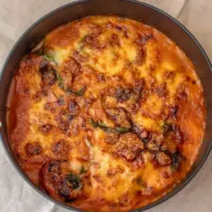 Set the air fryer to 180°C (356°F). Place the dish in the air fryer for about 18 to 20 minutes until the cheese is melted and bubbling.